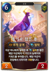 아군 하나에게 밀착한 후 밀착한 동안 해당 아군에게 이 카드의 능력치와 키워드를 부여합니다. 해당 아군이 전장에서 사라지면 귀환합니다.